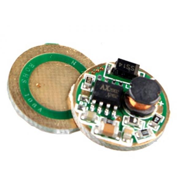 Импульсный понижающий драйвер для фонарика AX2002-10-1 (1A, 1 режим) имеет входное напряжение от 3,7 до 23В (от 1 до 5шт последовательно включенных Li-Ion или Li-Po аккумуляторов или несколько 1,5В батарей). Драйвер предназначен для применения в светодиодных фонариках и обеспечивает питание светодиода стабилизированным током. Драйвер импульсный т.е. имеет высокий КПД и позволяет использовать фонари с большим количеством батарей.Чем выше входное напряжение драйвера, тем ниже будет потребляемый от источника ток. Размеры драйвера: диаметр 17мм, высота 6,5мм. Драйвер построен на микросхеме AX2002, которая обеспечивает ток до 2А, так что при замене катушки, диода Шоттки и токозадающих резисторов вполне можено переделать этот драйвер на ток до 2А, нужно только помнить, что элементы питания фонаря должны обеспечить этот ток (2 аккумулятора 18650 последовательно или 4 батареи типа D как минимум). Драйвер предназначен для установки в 26мм модуль и может работать с светодиодами, рассчитанными на соответствующий ток.