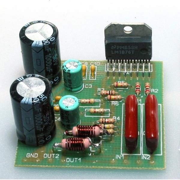 Усилитель выполнен на микросхеме LM1876. Она представляет собой высококачественный стереофонический усилитель серии Overture, имеет выходную мощность до 22Вт, напряжение питания от ±10 до ±32В, имеет защиту от перегрева, перегрузки, и систему мягкого включения для избавления от щелчков при подаче питания.